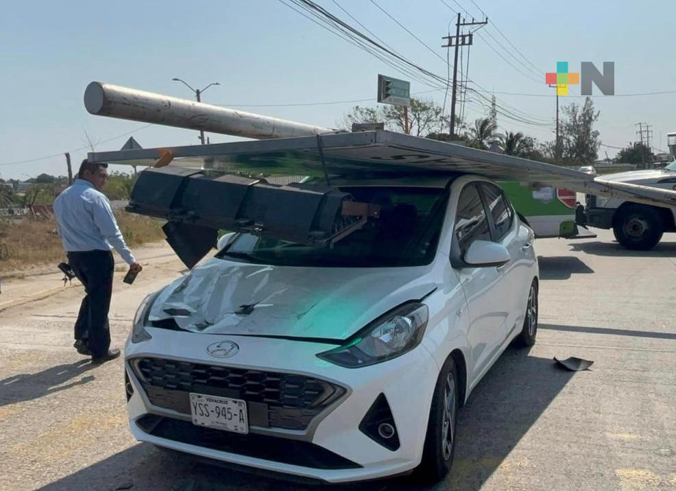 Un susto se llevó una mujer tras la caída de un semáforo sobre el toldo del auto que conducía a la altura de la Escuela Secundaria Técnica 96 de Coatzacoalcos.