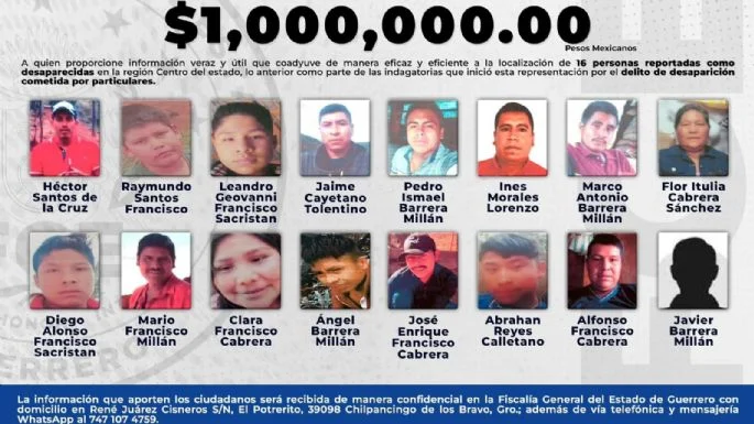 “La Fiscalía General del Estado (FGE Guerrero) ofrece $1.000.000.00 pesos como recompensa a quien proporcione información veraz y útil que coadyuve de manera eficaz y eficiente a la localización de 16 personas reportadas como desaparecidas en la región Centro del estado”, publicó.